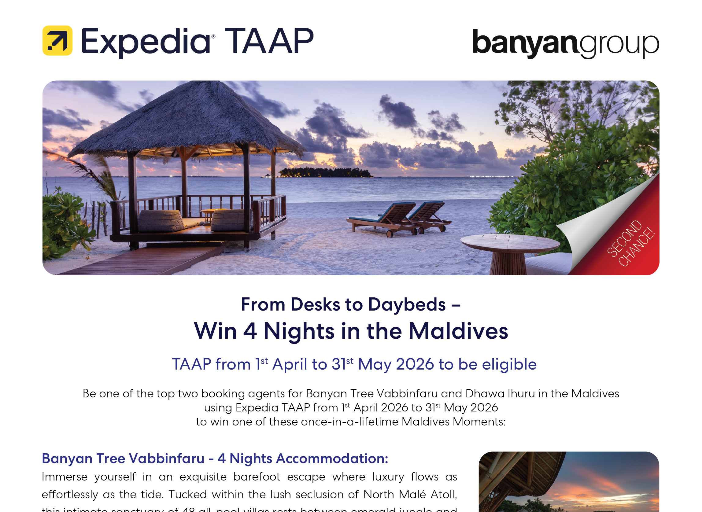 TAAP into Banyan Tree Vabbinfaru and Dhawa Ihuru in the Maldives from 1st Apr to 31st May 2026 to win a once-in-a-lifetime Maldives Moment!